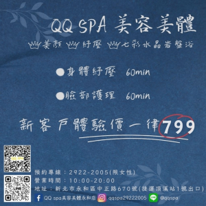 QQ SPA 美容美體|新北市永和美容美體 永和按摩 永和做臉 永和清粉刺 永和去角質 永和除毛 永和孕婦按摩 永和美白護膚 岩盤浴 永和臉部撥筋 SPA放鬆 刮痧 永和耳燭
